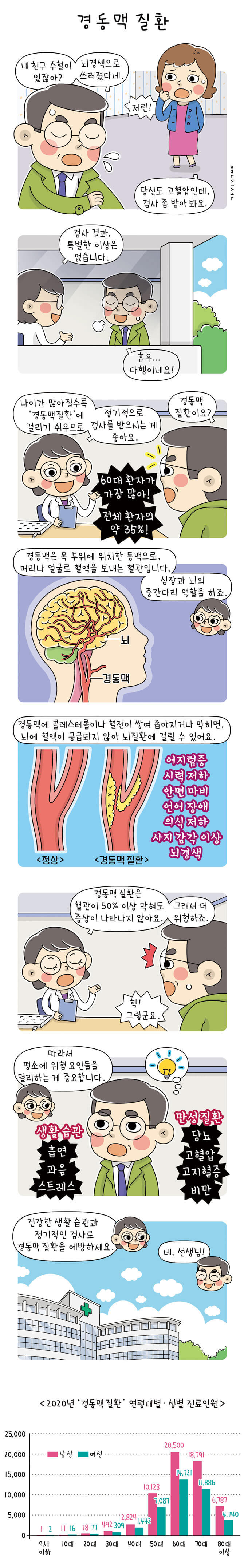 경동맥질환은 경동맥의 혈관벽이 두껍게 되어 혈액의 흐름이 감소하거나 막히는 질환을 말합니다. 주로 동맥경화증이나 혈관염, 혈전 등이 원인이 됩니다. 이러한 질환은 경동맥의 혈류가 감소하게 되면서 가슴 통증이나 호흡곤란, 심부전 등의 증상을 유발할 수 있습니다. 주로 혈압, 혈당, 혈중 콜레스테롤 등의 건강 검진을 통해 예방할 수 있습니다.