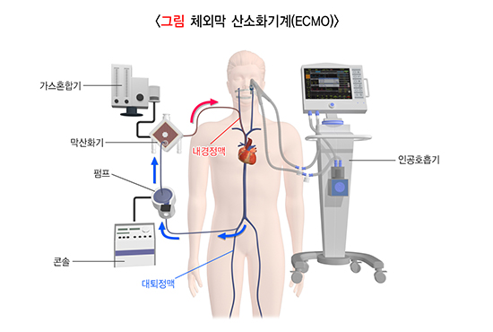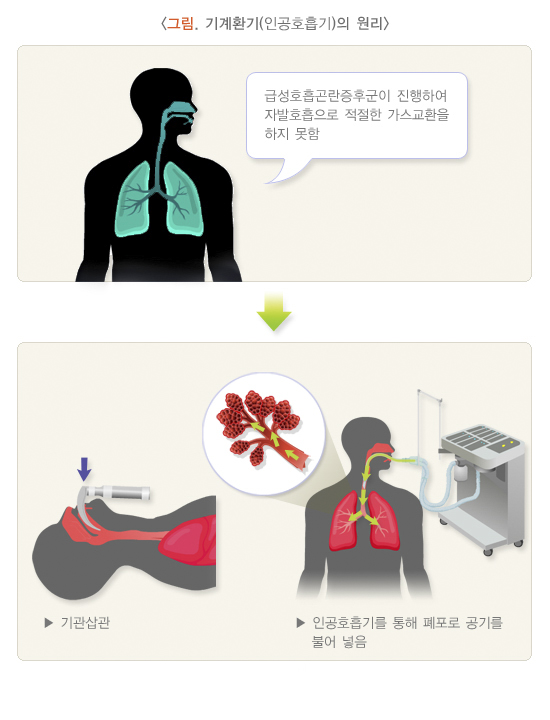 또한 기계환기기를 비롯한 여러 치료에도 산소공급과 이산화탄소 배출이 개선되지 않으면 체외막 산소화기계(extracorporeal membrane oxygenation, ECMO)를 적용하여 원인질환을 교정하고 손상된 폐가 회복될 때까지 생존을 유지할 수 있습니다. 최근에는 기계환기에 의한 폐손상을 줄이기 위해 조기에 ECMO치료를 적용하는 연구도 발표된 바 있습니다.