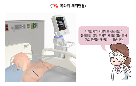 기계환기기 치료에도 산소공급이 불충분한 경우 복와위 체위변경 적용을 통해 산소 공급을 개선할 수 있다는 여러 연구결과가 발표되어 중증 급성호흡곤란 증후군의 표준치료로 자리잡고 있습니다.