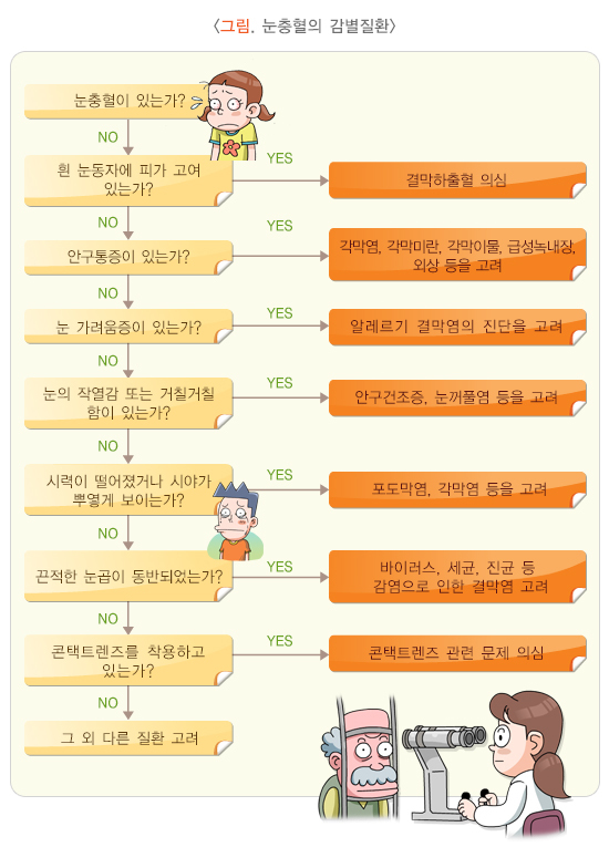 콘택트렌즈를 사용하고 있는 사람은 렌즈 사용을 중단하고도 충혈이 지속된다면 안과 진료를 받아야 하고, 이물질이 눈에 들어간 적 있거나 인공눈물 사용 후에도 호전이 없으면 병원 방문을 권유합니다.