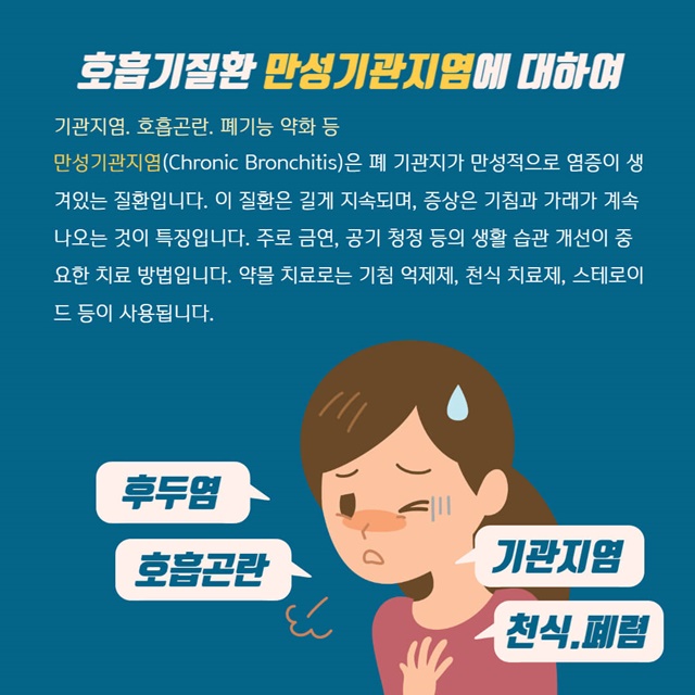 만성기관지염(Chronic Bronchitis)은 폐 기관지가 만성적으로 염증이 생겨있는 질환입니다. 이 질환은 길게 지속되며, 증상은 기침과 가래가 계속 나오는 것이 특징입니다. 주로 금연, 공기 청정 등의 생활 습관 개선이 중요한 치료 방법입니다. 약물 치료로는 기침 억제제, 천식 치료제, 스테로이드 등이 사용됩니다.