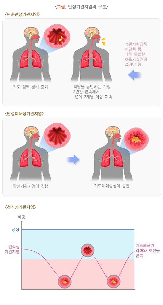 만성기관지염은 다음과 같이 세 가지로 구분해 볼 수 있습니다.