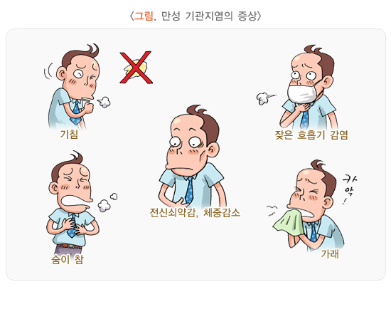 감염과 자극성 물질의 흡입으로 기도 내의 점액분비가 증가하고, 섬모(가는 털)의 기능을 저하시켜서 점액 배출능력이 떨어집니다. 또한 폐 안에 있는 탐식세포 기능장애로 감염에 대한 저항력이 감소하여 기도 감염이 반복되는 것입니다.
