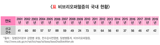2000년 법정감염병으로 지정된 이후, 매년 수십 명의 환자가 지속적으로 발생하고 있으며 10만명 당 발생률은 0.05~0.18명 정도로 높지는 않습니다. 하지만, 확진되지 않은 상태에서 사망하거나 치료받은 환자들을 포함한다면 실제 발생건수는 이보다 훨씬 많을 것으로 추정됩니다. 40세 이상 남성에 흔하며, 남녀 비율은 7:1 정도입니다. 사망자 대부분은 만성 간질환 등 기저질환을 가진 고위험군입니다.