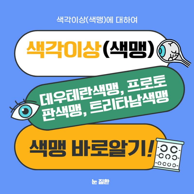 색각이상, "색맹"이라고 알려져 있습니다. 색각이상은 색을 보는 능력이 제한되거나 일부 또는 모든 색상을 구별할 수 없는 상태를 가리킵니다. 유전적인 원인에 의해 발생하는 경우가 많습니다. 색각이상은 세 가지 주요 유형으로 분류됩니다. 데우테란색맹 (빨강과 녹색을 구별하지 못함), 프로토판색맹 (빨강을 구별하지 못함) 및 크리타남색맹 (파랑을 구별하지 못함)입니다.