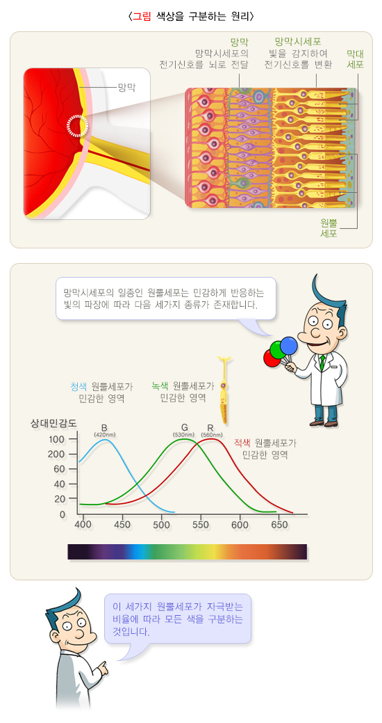 색의 인식은 구체적으로 망막 내의 시세포 중 하나인 원뿔세포(cone cell)의 기능이 좌우합니다. 원뿔세포는 빛을 감지하여 그 자극을 신경신호로 바꾸어줍니다. 이 원뿔세포는 민감하게 반응하는 빛 파장의 영역이 종류에 따라 다르며(분광민감도) 이것은 각 원뿔세포가 가지는 고유한 특성입니다. 분광민감도에 따라 세 가지 종류로 나눌 수 있는데 긴 파장에 민감한 원뿔세포(long wavelength-sensitive cone; 570~590nm), 중간 파장에 민감한 원뿔세포(medium wavelength-sensitive cone; 535~550nm), 그리고 짧은 파장에 민감한 원뿔세포(short wavelength-sensitive cone; 440~450nm) 등입니다.