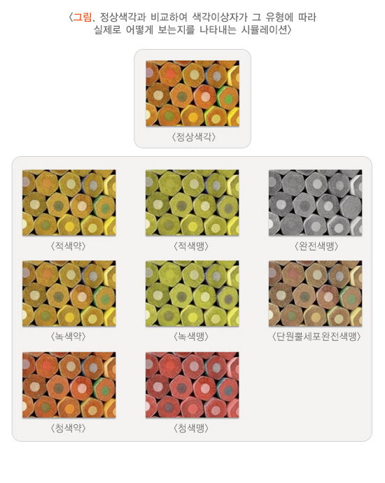 한 연구에 의하면 이상삼색형색각자의 66%, 이색형색각자의 99%가 색각이상으로 인해 일상생활에 불편을 느낀다고 합니다. 색각이상의 유형에 따라 실제 색각이상자가 어떻게 사물의 색을 느끼는지를 시뮬레이션하면 다음 그림과 같습니다.