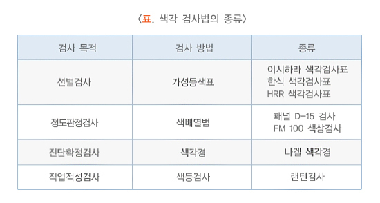 색각이상에 대한 검사는 그 검사 목적에 따라 선별검사(Screening), 정도판정검사(Grading), 진단확정검사(Diagnostic), 직업적성검사(Vocational)로 나눌 수 있습니다. 각 검사의 구체적 종류는 다음과 같습니다.