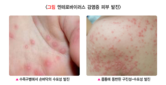 엔테로바이러스(장바이러스) 감염은 소아에서 매우 흔하며 다양한 질환을 일으킵니다. 피부 발진과 관련된 대표적인 엔테로바이러스 감염 질환이 수족구병입니다. 입에는 혀, 입천장, 잇몸 및 입술 등에 작은 크기의 궤양이 발생합니다. 피부 발진은 손과 발에 수포성으로 나타나는데 손바닥과 발바닥보다 손등과 발등에 더 많습니다. 몸통이나 엉덩이에도 발진이 나타날 수 있습니다. 특별한 항바이러스제 치료는 없습니다.