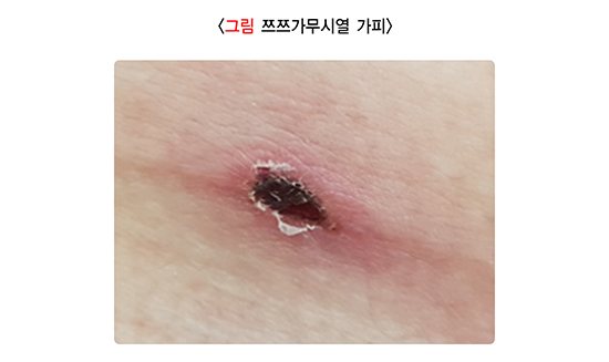 쯔쯔가무시열은 털진드기 유충에 물려서 발생하는 세균 감염증입니다. 털진드기의 서식지는 농경지, 텃밭, 주거지 주변 풀이 있는 장소 등이며 국내에서는 9~12월에 많이 발생합니다. 소아에서는 경증부터 중증까지 다양한 증상을 보일 수 있습니다. 털진드기 유충에 물린 후 10~12일 뒤에 감기와 유사한 증상을 보이지만 고열이 지속됩니다. 증상이 발생하고 3~7일에 홍반성 구진성 발진이 몸통에서 시작하여 팔다리로 퍼집니다. 진드기가 물린 자리에 붉은 테두리를 동반한 통증이 없는 가피가 형성됩니다(그림). 소아에서 쯔쯔가무시열 발생 시 폐렴 및 뇌수막염 등 심각한 합병증이 발생할 수 있으며, 항생제 치료가 필요합니다.