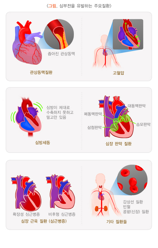 심부전 환자들은 심부전 증상을 악화시킬 수 있는 다른 질병유무에 대한 검사를 받고, 가능하다면 그에 대한 질병을 치료받아야 합니다. 빈혈, 갑상선 질환, 콩팥 질환 등이 대표적인 질환들입니다.