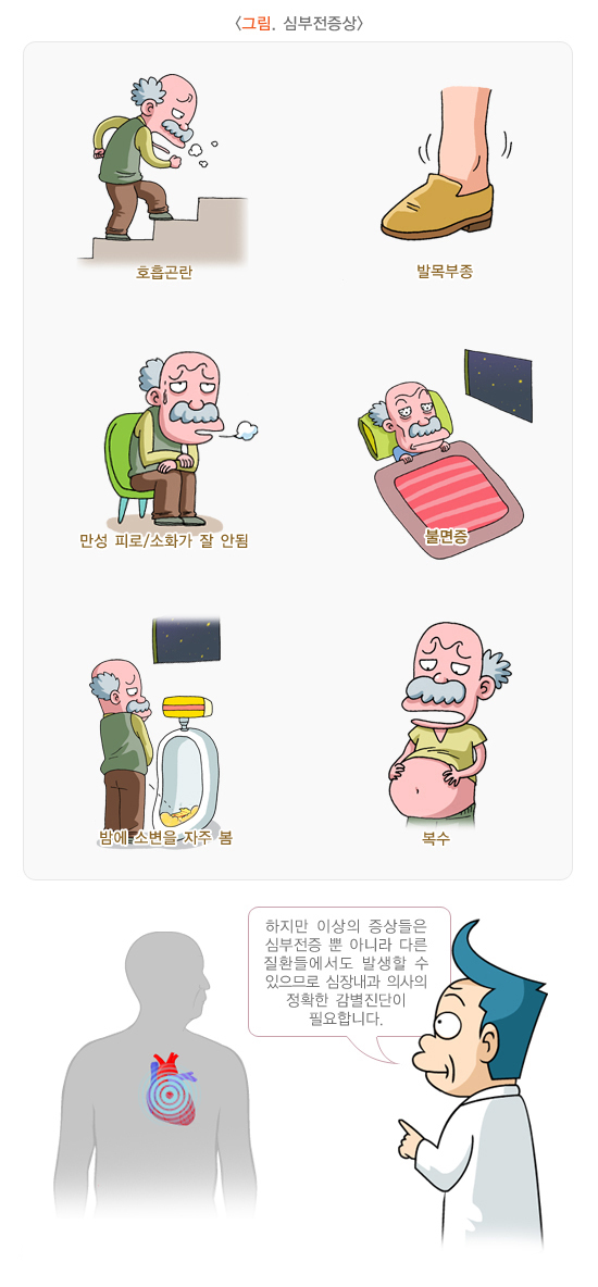 각종 심장질환으로 인해 심장의 고유 기능이 악화되어 전신에 충분한 혈류를 보내지 못하는 상태를 심부전이라고 합니다. 좌심장의 기능 감소에 의해 체순환이 감소하면 피로감과 쇠약감, 그리고 폐에 물이 차면서 발생하는 호흡곤란이 생깁니다. 우심장의 기능 감소에 의해서는 주로 전신이 붓는 증상이 나타나게 됩니다.