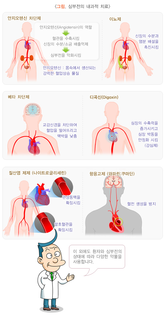 약물은 심장의 펌프 기능을 향상하고 심장에 가해지는 스트레스를 줄여 줌으로써 심부전 환자의 증상을 호전시켜 줍니다. 의사가 지시한 대로 정확히 약을 복용하시고 복용하는 약의 부작용이 생기면 꼭 의사와 상의하십시오.