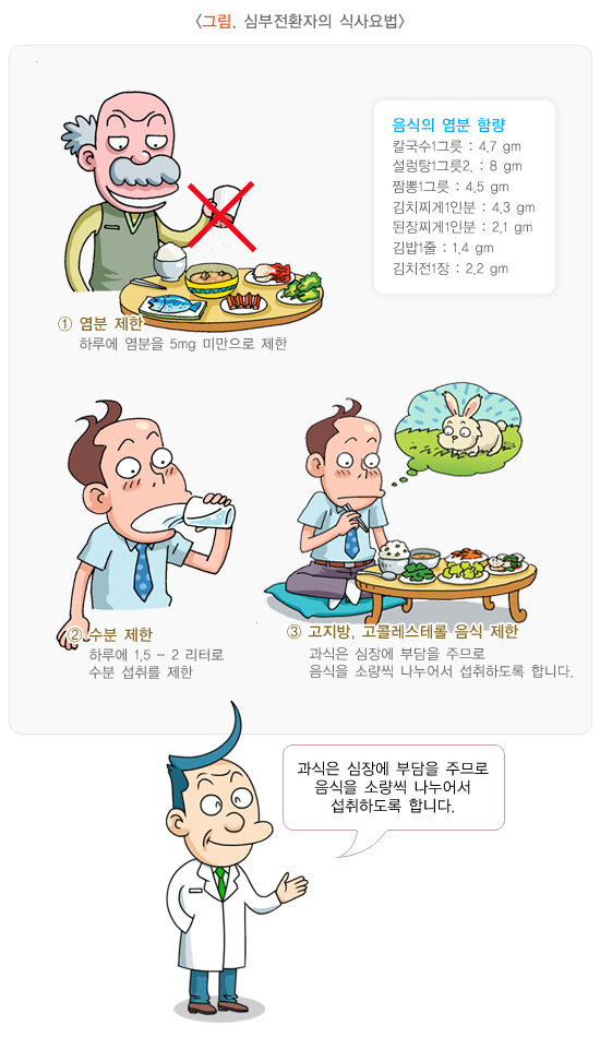 심부전 환자에서 식사요법은 심장의 부담을 최소화하고 심근의 수축력을 올리는 것을 목적으로 합니다. 과식은 심장에 부담을 주므로 피하고 식사를 소량씩 나누어서 섭취하도록 합니다. 또한 과도한 비만은 그 자체가 심장에 부담을 주므로 적절한 체중을 유지하시는 것이 좋습니다.