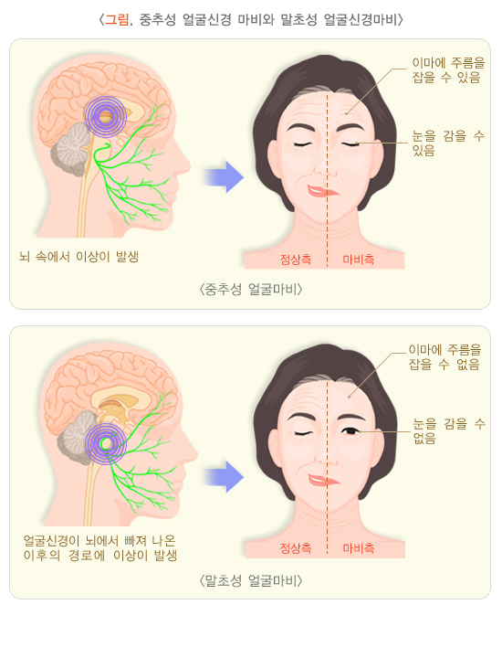 얼굴신경마비(안면신경 마비)는 크게 중추성과 말초성으로 나눌 수 있습니다. 인체의 모든 근육은 반대쪽 뇌의 지배를 받는데 얼굴 근육도 예외는 아닙니다. 뇌 속에서 얼굴 근육으로 연결되는 신경이 지나가는 통로에 이상이 발생하여 얼굴신경마비가 오는 것을 중추성 얼굴신경마비라고 하고, 얼굴신경이 뇌에서 빠져 나온 이후의 경로에 이상이 발생하여 마비가 오는 것을 말초성 얼굴신경마비라고 합니다.