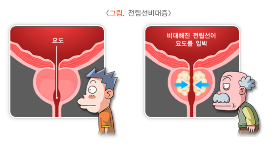 젊은 남성의 전립선은 호두알 정도의 크기이며 나이가 들수록 크기가 점점 커지는데, 그 정도가 심해지면 전립선 내부를 지나가는 요도를 눌러서 각종 증상을 일으키는데 이것을 전립선비대증이라고 합니다.