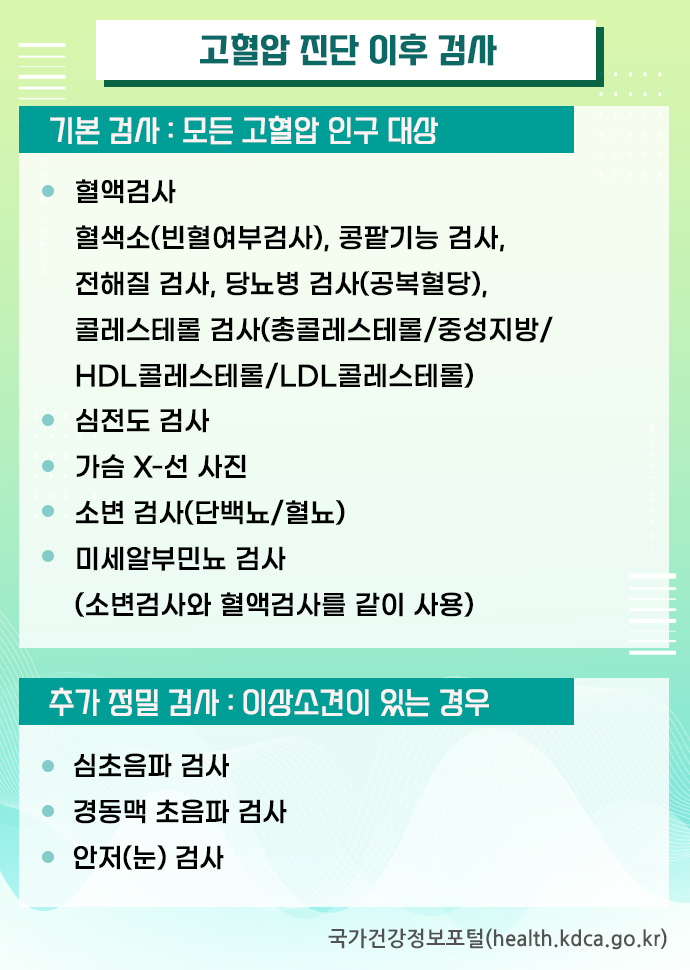 이런 모든 검사들의 목적은 고혈압의 합병증 중에서 증상을 보이지 않는 장기손상을 찾아내 관리하기 위한 것입니다.