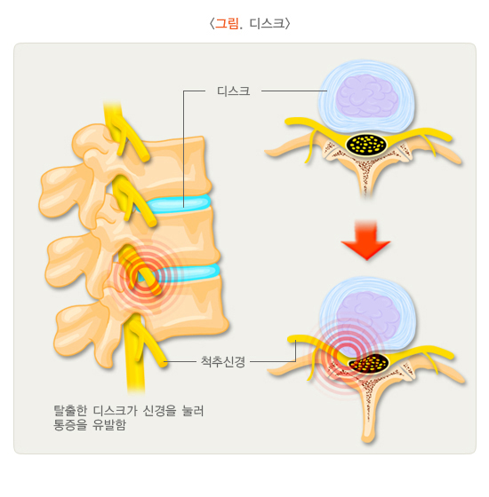 추간판탈출증의 가장 흔한 형태인 요추 추간판탈출증과 경추추간판탈출증으로 구분하여 그 증상을 살펴보겠습니다.