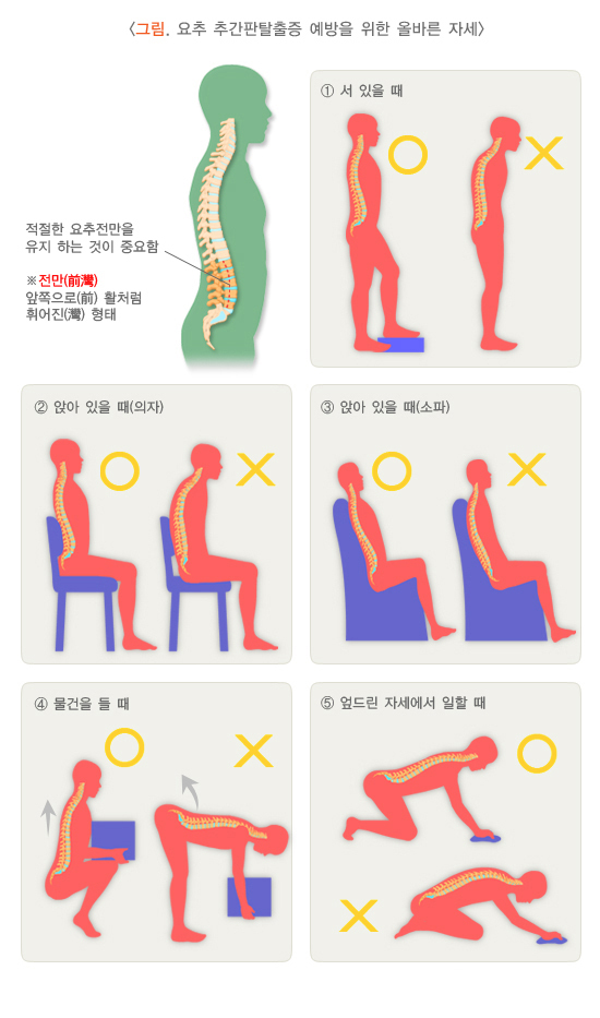 요추 추간판탈출증을 예방하기 위해서는 무엇보다 올바른 자세 교육이 중요합니다. 다음 그림에서와 같이 올바른 자세를 가지도록 하는데, 특히 적절한 요추전만을 유지하도록 하는 것이 중요합니다.