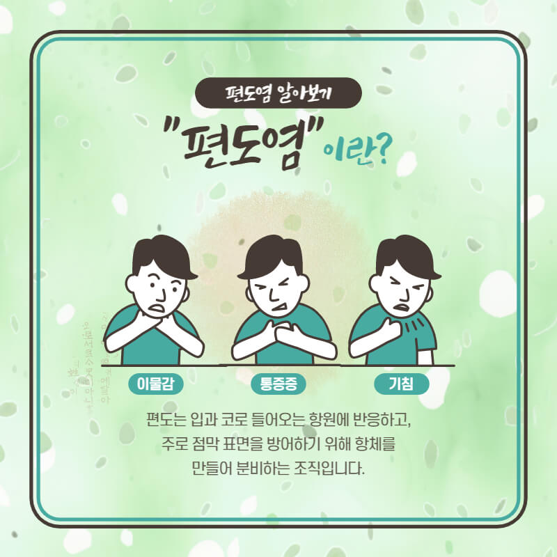 편도염은 편도라는 부위의 염증을 가리키는 용어입니다. 편도는 목의 뒷부분에 위치한 작은 유형의 림프조직입니다. 편도는 몸의 면역 체계에서 중요한 역할을 하며, 외부로부터 들어오는 세균이나 바이러스로부터 몸을 보호하는 역할을 합니다. 편도염은 일반적으로 감기나 기침, 코막힘 등의 상기도 감염과 관련이 있습니다.