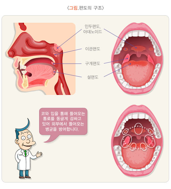 편도는 입과 코로 들어오는 항원에 반응하고, 주로 점막 표면을 방어하기 위해 항체를 만들어 분비하는 조직입니다. 흔히 말하는 편도는 '구개편도'로 목젖 양쪽에 동그랗게 보이는 구조입니다. 그 밖에도 혀 뒤쪽으로 불규칙한 모양을 띠는 설편도가 있고, 목젖과 연구개 뒤쪽 콧구멍이 열리는 곳 주위로 인두편도, 혹은 아데노이드라 불리는 편도조직이 있으며, 귀와 연결되는 통로인 이관의 개구부 주위로 이관편도가 있습니다.