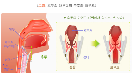 후두염은 주로 바이러스 감염에 의해 후두에 염증이 생기는 질환입니다. 후두는 공기가 통하는 기도의 시작 부위에 위치하는 기관으로 성대를 포함하고 있어 숨 쉬고 말하는 데 중요한 역할을 합니다. 후두의 염증은 후두에 국한되는 것이 아니라 아래로 확산되어 기관 또는 기관지의 병변을 동반하는 경우가 많습니다. 병변의 범위에 따라 후두염, 후두기관염, 후두기관기관지염, 후두기관지폐렴으로 분류하고, 이 질환들을 모두 포함하여 크루프라고 정의하는 경우가 많습니다. 급성 후두개염도 후두 염증을 동반할 수 있지만 주로 세균 감염에 의해 발생하며 임상 증상이 매우 심하고 급성 호흡곤란증을 동반하므로 별도로 분류합니다. 크루프의 주증상은 후두, 기관 및 기관지의 점막이 염증으로 인해 부어서 기도가 좁아지면서 발생합니다. 기도가 좁아지면 공기가 통과하기 어려워 숨을 들이쉴 때 고음의 휘파람 소리(협착음, 천음)가 납니다. 후두에 염증이 생기면 후두 부위에 존재하는 성대도 영향을 받아 목소리가 쉽니다. 또한 염증으로 인해 점액 분비가 증가하는데, 이를 배출하기 위해 기침을 할 때 좁아진 기도로 공기가 나가면서 염증으로 인해 부은 성대가 자극을 받아 개 짖는 소리와 비슷한 기침 소리가 납니다.